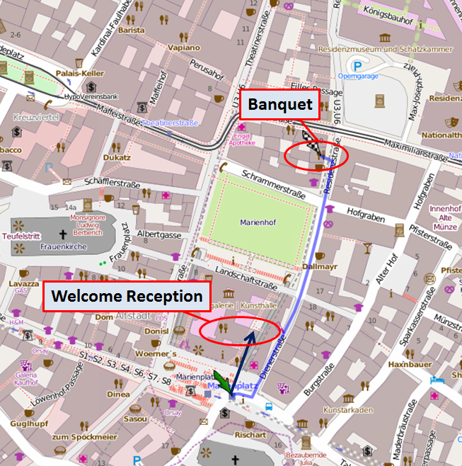 The Conference Banquet takes place in one of the famous Wirtshäuser in the heart of Munich on Thursday evening at 19:00: Zum Franziskaner, Residenzstraße 9, München. The underground U6 takes you to the Marienplatz. After a 5 min walk you will reach “Zum Franziskaner” (see map). Please come to the Studentensaal.